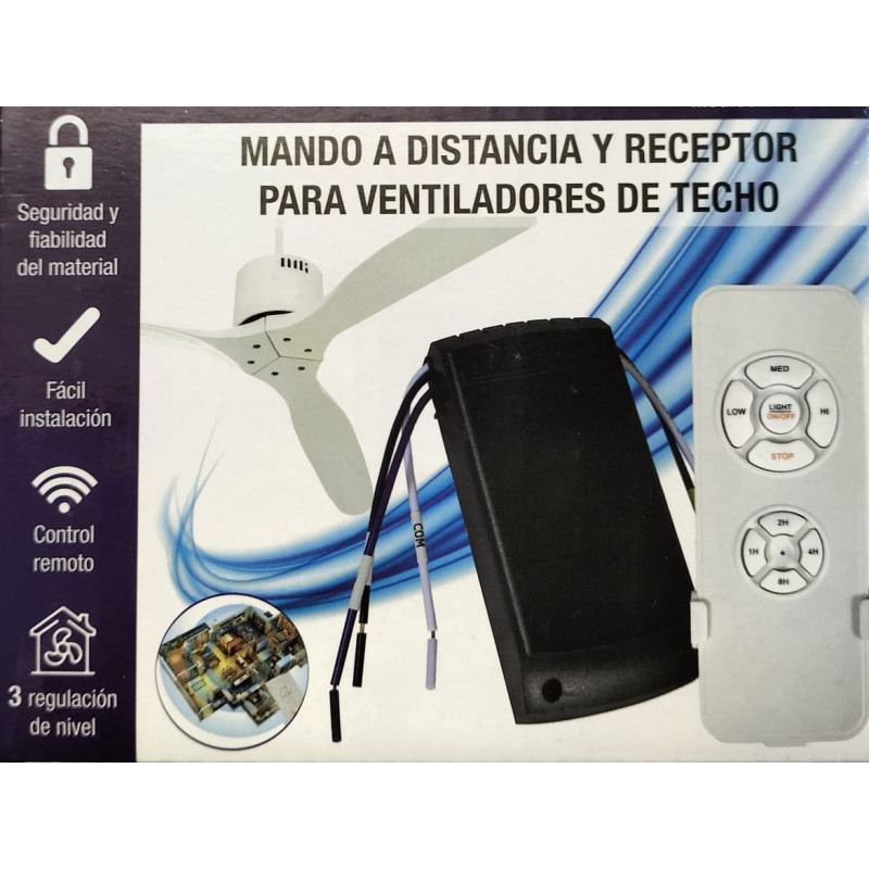 Con este práctico kit podrá adaptar o sustituir un receptor para su ventilador de techo y poder manejarlo con su mando a distancia, eligiendo entre 3 niveles de velocidad, luz encendida o apagada y programar su tiempo de funcionamiento.